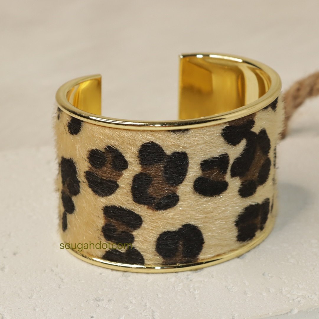 سوار كف مفتوح بنقشة جلد النمر المخملية، بتصميم فينتاج عريض ولافت، يعكس جرأة أنثوية وفخامة مميزة