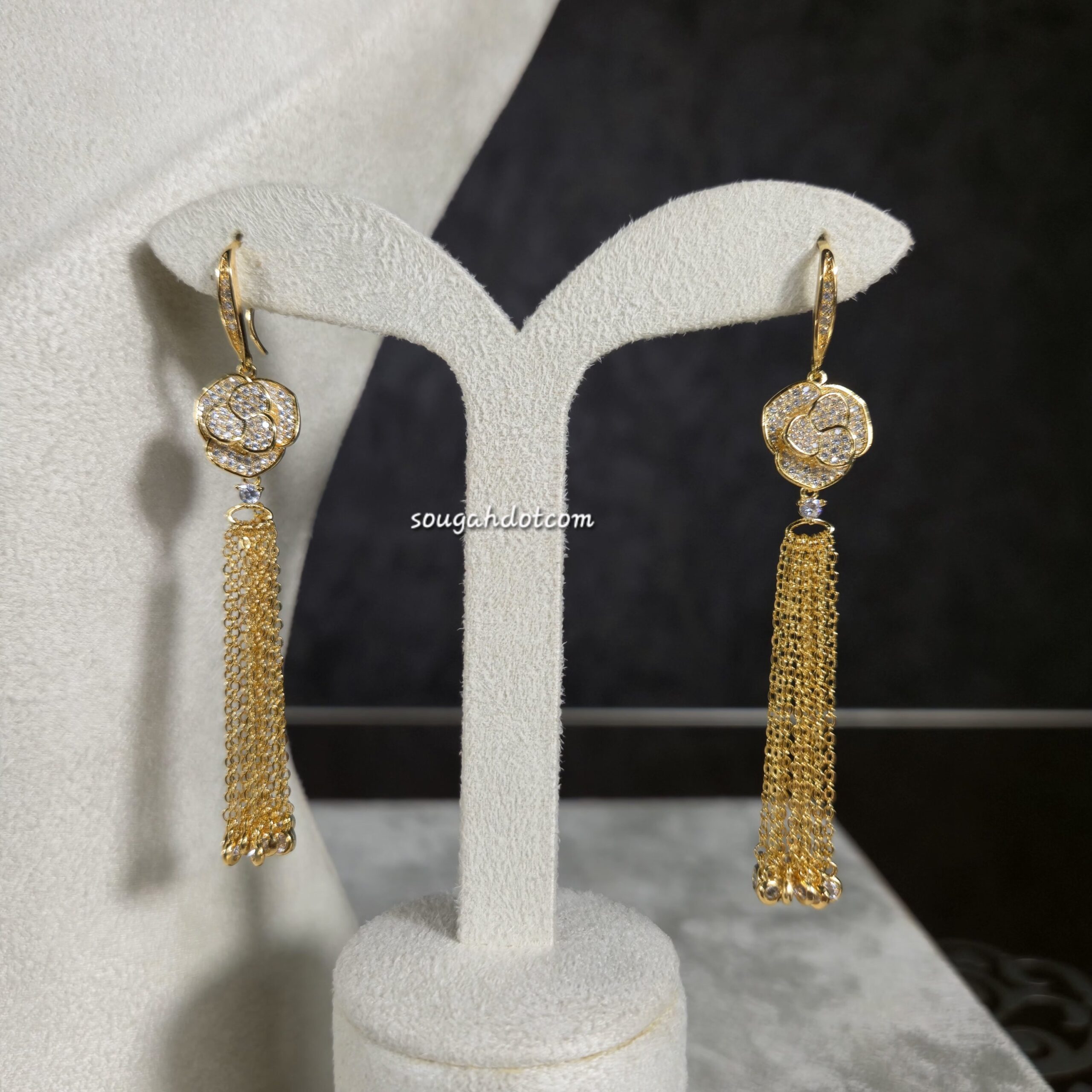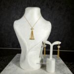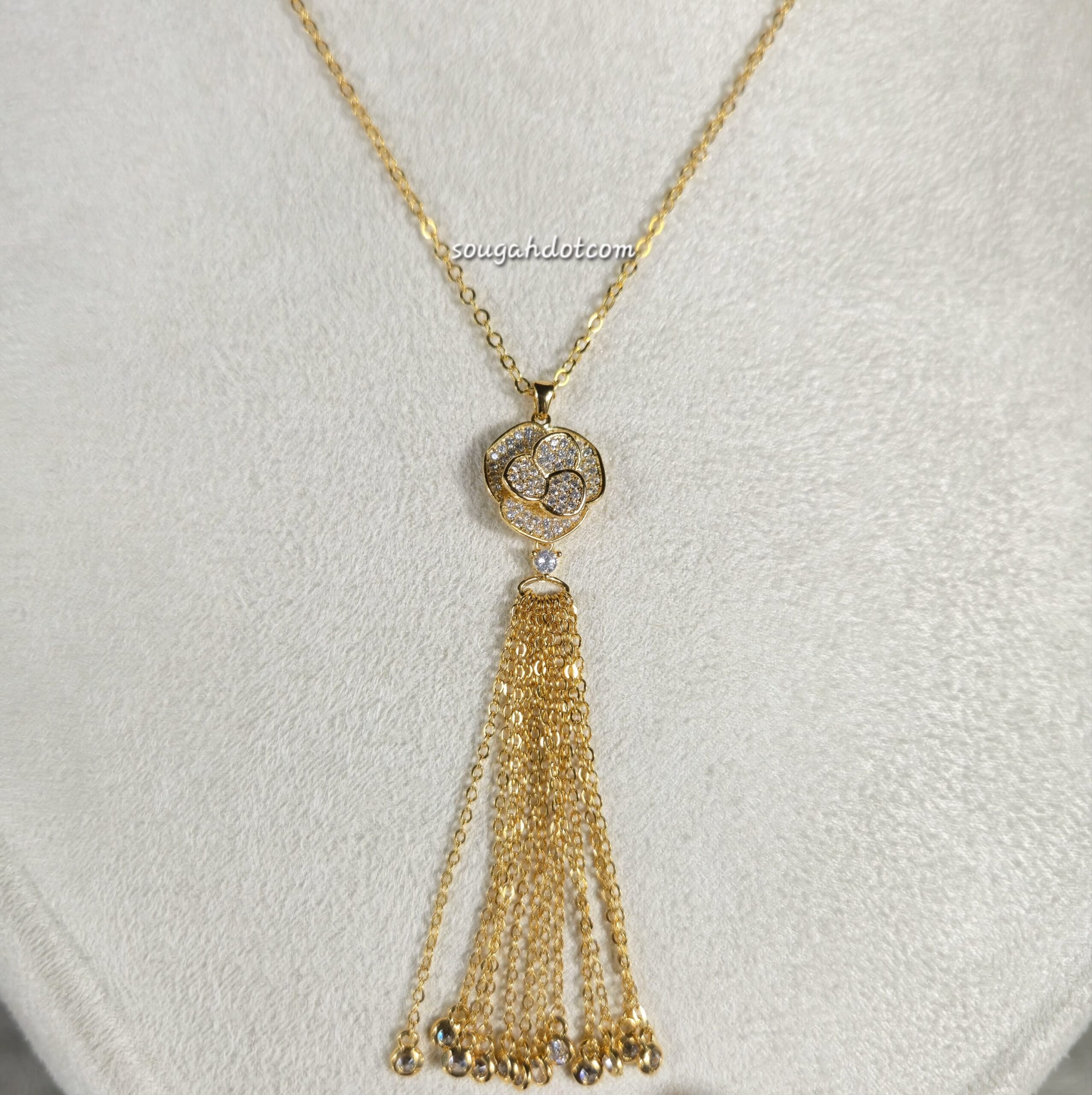 طقم مطلي ذهب بتصميم أنثوي راقٍ يتكوّن من عقد وأقراط بسلاسل متدلّية ناعمة، مرصّع بأحجار الزركون اللامعة لمسة خفيفة من الفخامة مع كل حركة. قطعة مثالية لإطلالات المساء أو لإضافة لمسة أنيقة على اللوك اليومي. مقاوم لتغيّر اللون ومناسب للبشرة الحساسة.