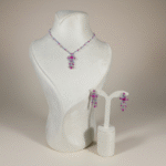 تصميم صنع ايصالي يتكوّن من عقد بتفاصيل مرصوفة بدقة تنتهي بتعليقة متدلية أنثوية، مع أقراط متناسقة تعكس نفس الروح الحيوية الراقية.
