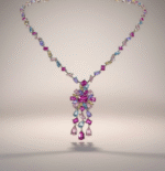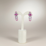 طقم فاخر مطلي ذهب ابيض مرصّع بأحجار زركون عالية الجودة بتدرجات فوشيا زاهية ولمسات لونية ناعمة تضيف إشراقة مميزة.