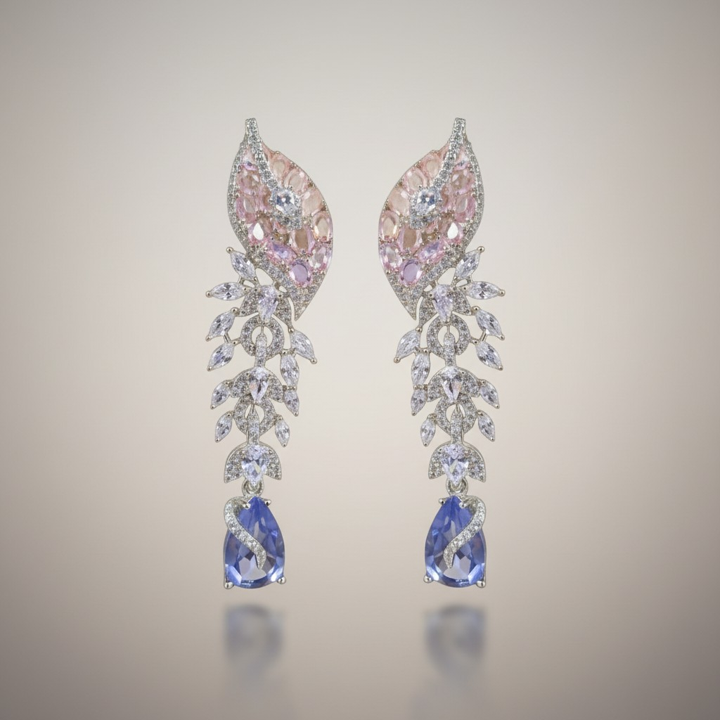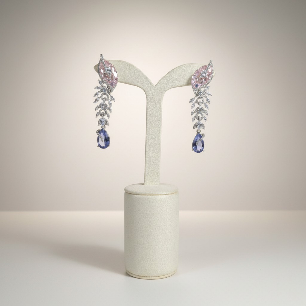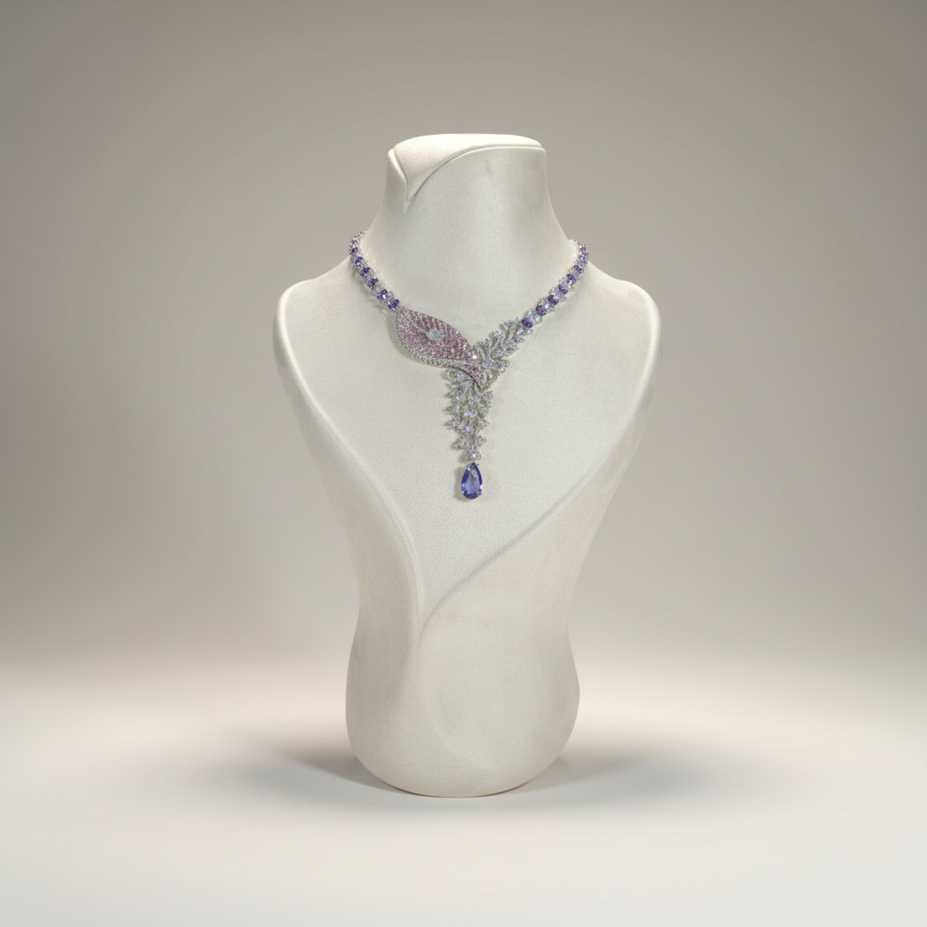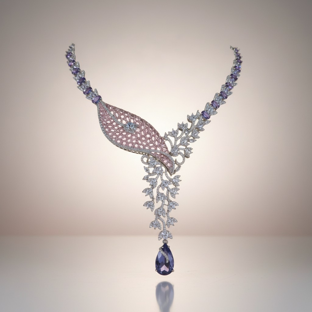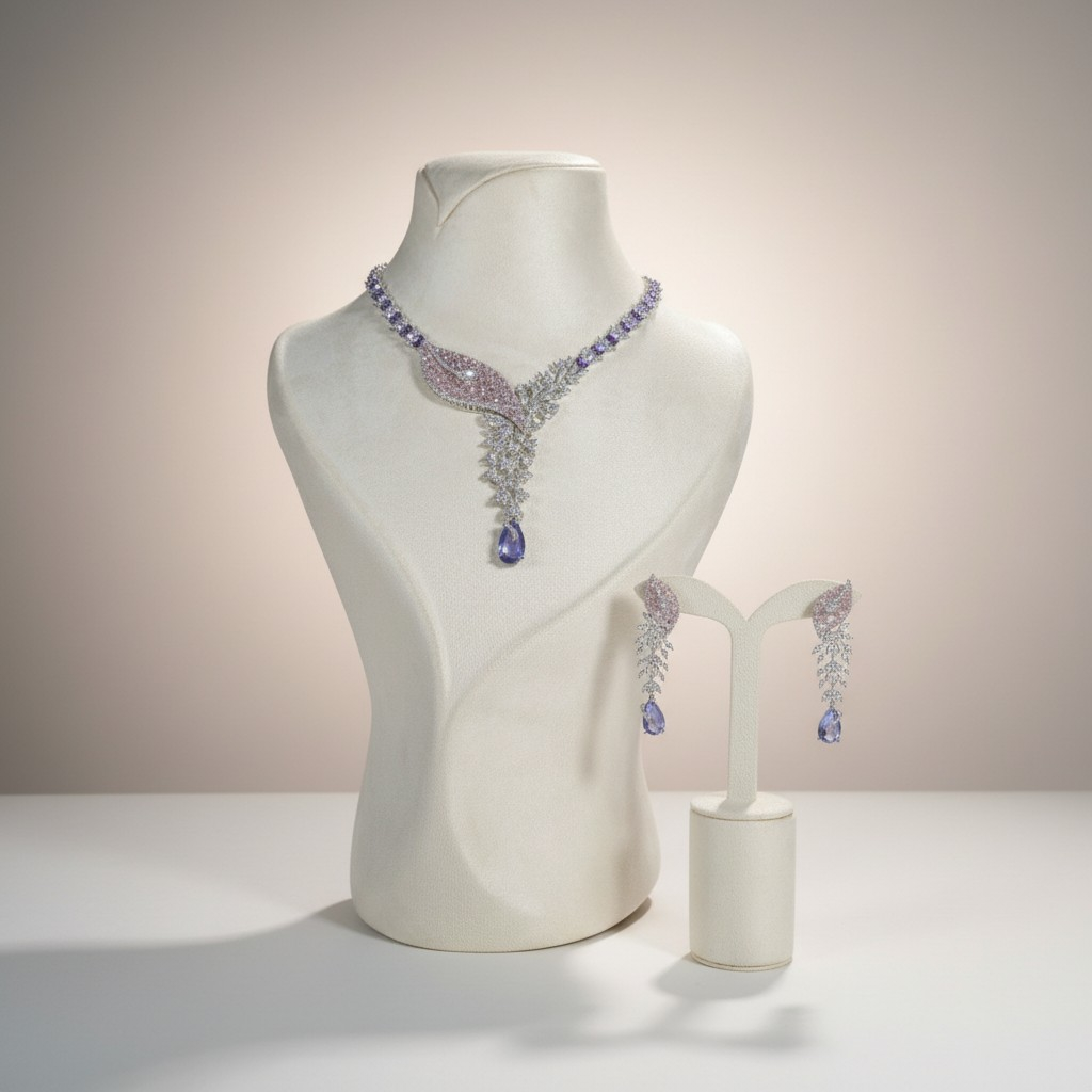 طقم مجوهرات مطلي بالذهب الأبيض مرصّع بأحجار زركون لامعة بتصميم أنيق مستوحى من أشكال الطبيعة الراقية. يتزين العقد بتفاصيل دقيقة تجمع بين الأحجار البنفسجية والوردية مع تعليقة متدلية تنتهي بحجر بنفسجي بشكل قطرة يمنح القطعة حركة ناعمة وبريقاً لافتاً.