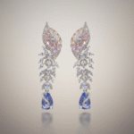 يأتي الطقم مع أقراط متناسقة بنفس التصميم لتكمل الإطلالة بتناغم أنثوي راقٍ يبرز جمال التفاصيل ودقة الصياغة. تصميم يجمع بين الرقي والنعومة ليكون خياراً مثالياً للمناسبات والسهرات الراقية.