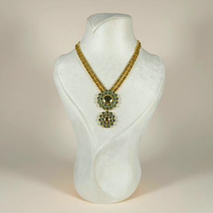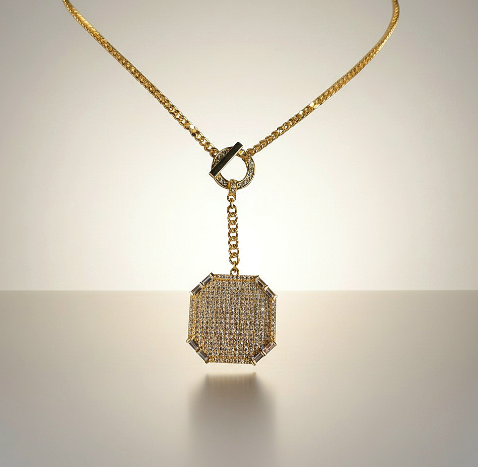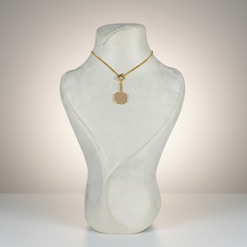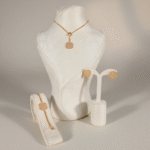 طقم أنيق مطلي بالذهب عيار 18 قيراط بتصميم عصري يجمع بين البساطة الراقية والتفاصيل الفاخرة. يتميز العقد بتعليقة هندسية أنيقة ذات ملمس ذهبي ناعم يعكس الضوء بطريقة هادئة ويمنح القطعة حضوراً راقياً على العنق.