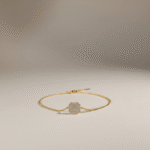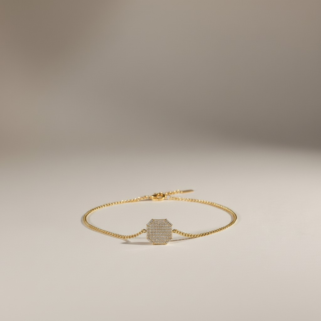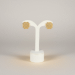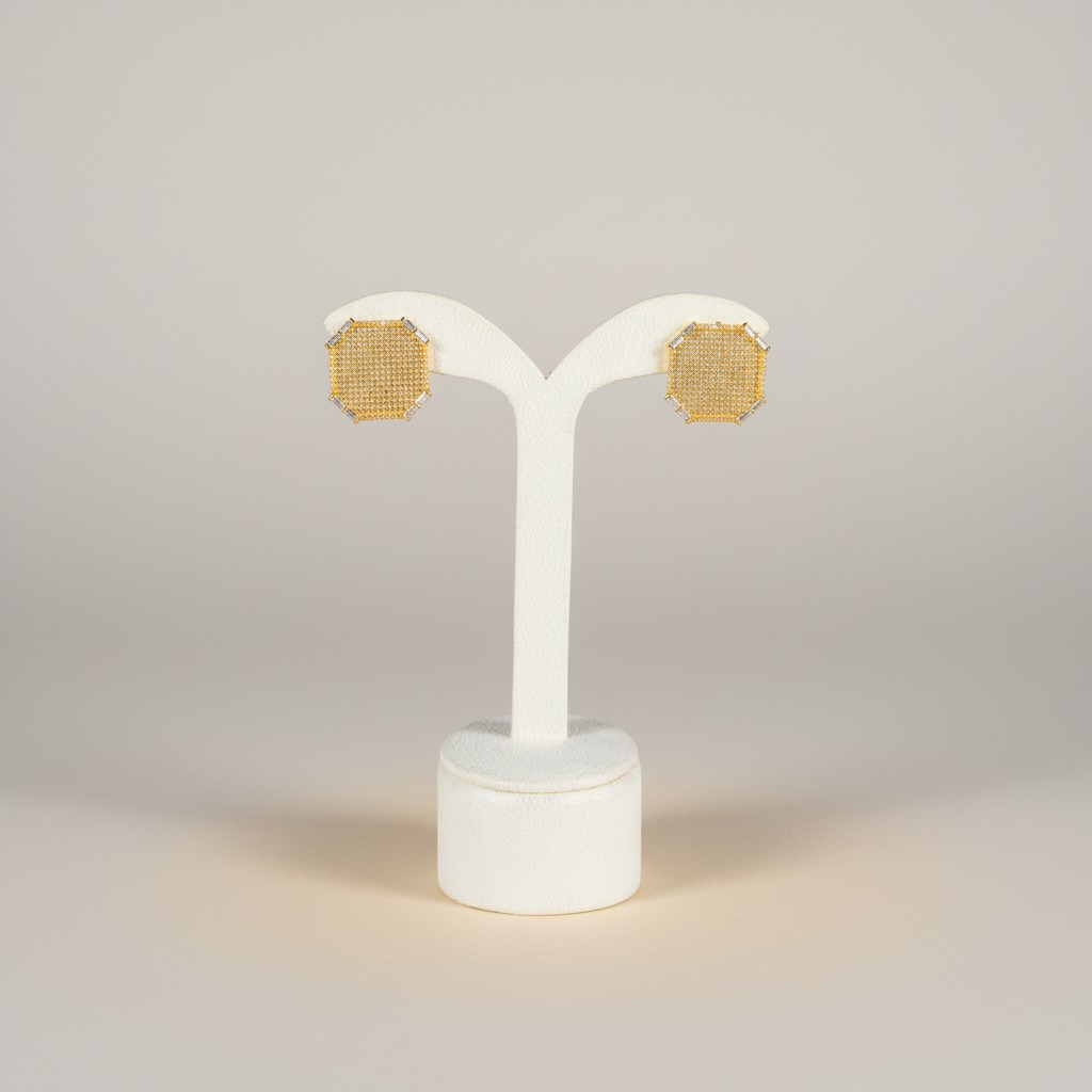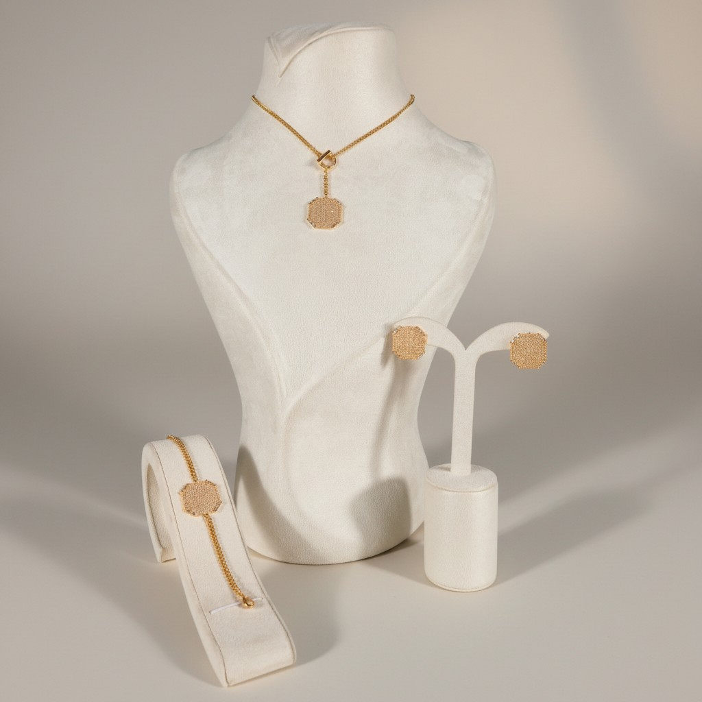 تأتي الأقراط بتصميم متناسق يحمل نفس الشكل الهندسي المميز ليكمل الإطلالة بتناغم أنيق، بينما يضيف السوار لمسة متوازنة من الفخامة الهادئة ليكتمل الطقم بثلاث قطع متناسقة.