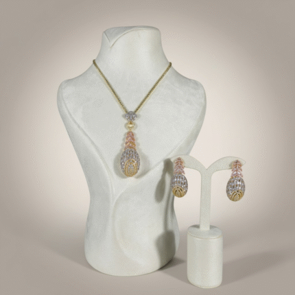 طقم أنيق مطلي بالذهب عيار 18 قيراط بتصميم عصري يجمع بين البساطة الراقية والتفاصيل الفاخرة. يتميز العقد بتعليقة هندسية أنيقة ذات ملمس ذهبي ناعم يعكس الضوء بطريقة هادئة ويمنح القطعة حضوراً راقياً على العنق.