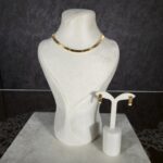 طقم أنيق مطلي ذهب بتصميم ناعم وعصري، يجمع بين عقد تشوكر بخط ذهبي نظيف وأقراط متناسقة تمنح الإطلالة لمسة راقية بدون مبالغة. قطعة مثالية للاستخدام اليومي أو المناسبات الخفيفة، سهلة التنسيق وتضيف بريقًا هادئًا لكل ستايل. مصنوع من مواد عالية الجودة، مضاد للحساسية ومقاوم لتغيّر اللون.