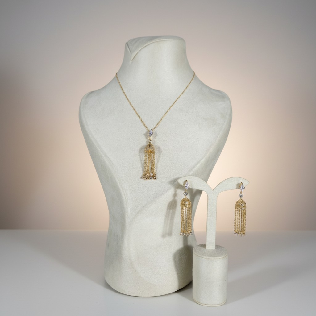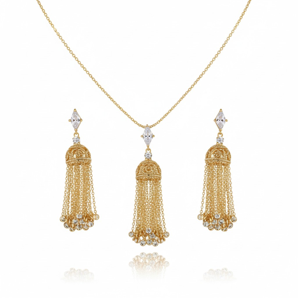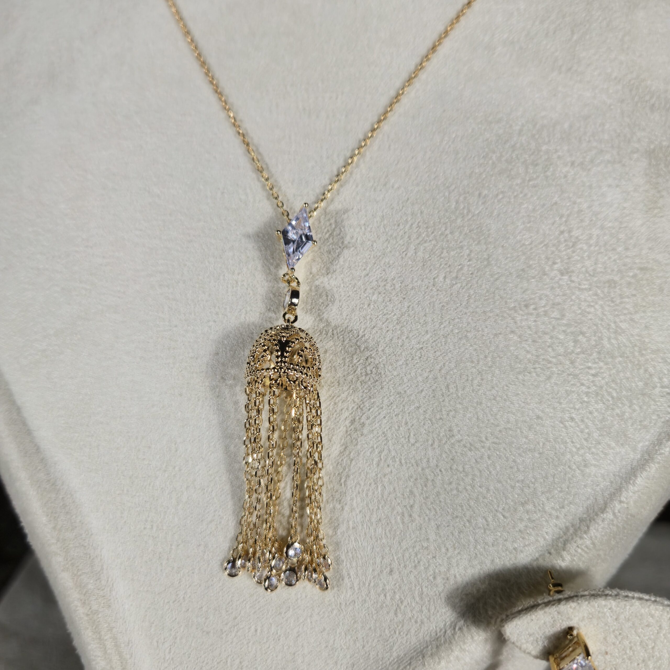 طقم مطلي ذهب بتصميم رقيق يتكوّن من عقد بسلسلة ناعمة وتعليقة تنسدل منها سلاسل ذهبية خفيفة، مع أقراط متناسقة تضيف حركة أنثوية جذابة للإطلالة. مرصّع بحجر الزركون ليمنح بريقًا هادئًا يناسب الإطلالات اليومية والمناسبات الخاصة. قطعة خفيفة على العنق، سهلة التنسيق، ومثالية لمن تحب الأناقة الناعمة.