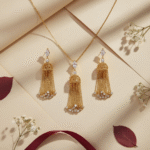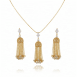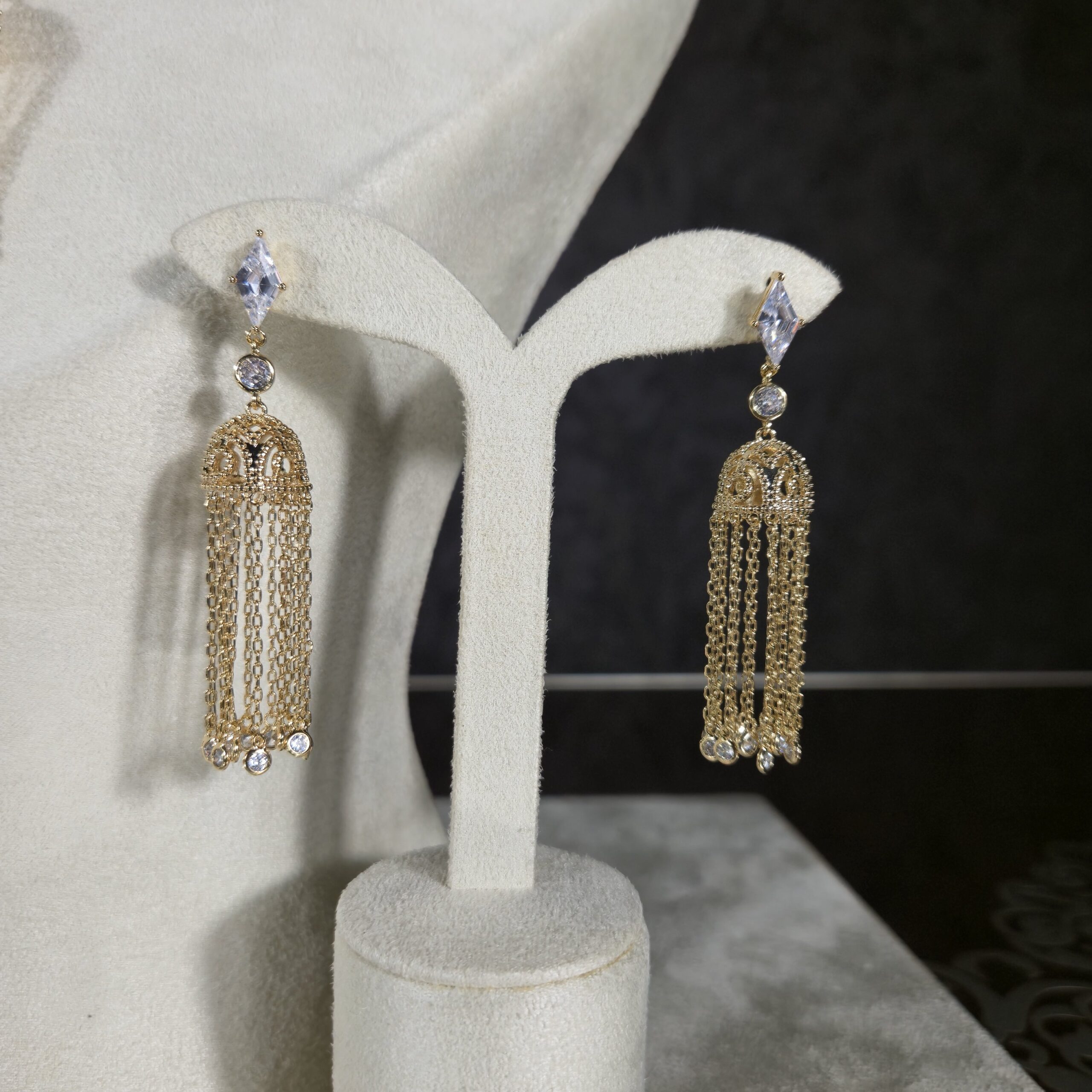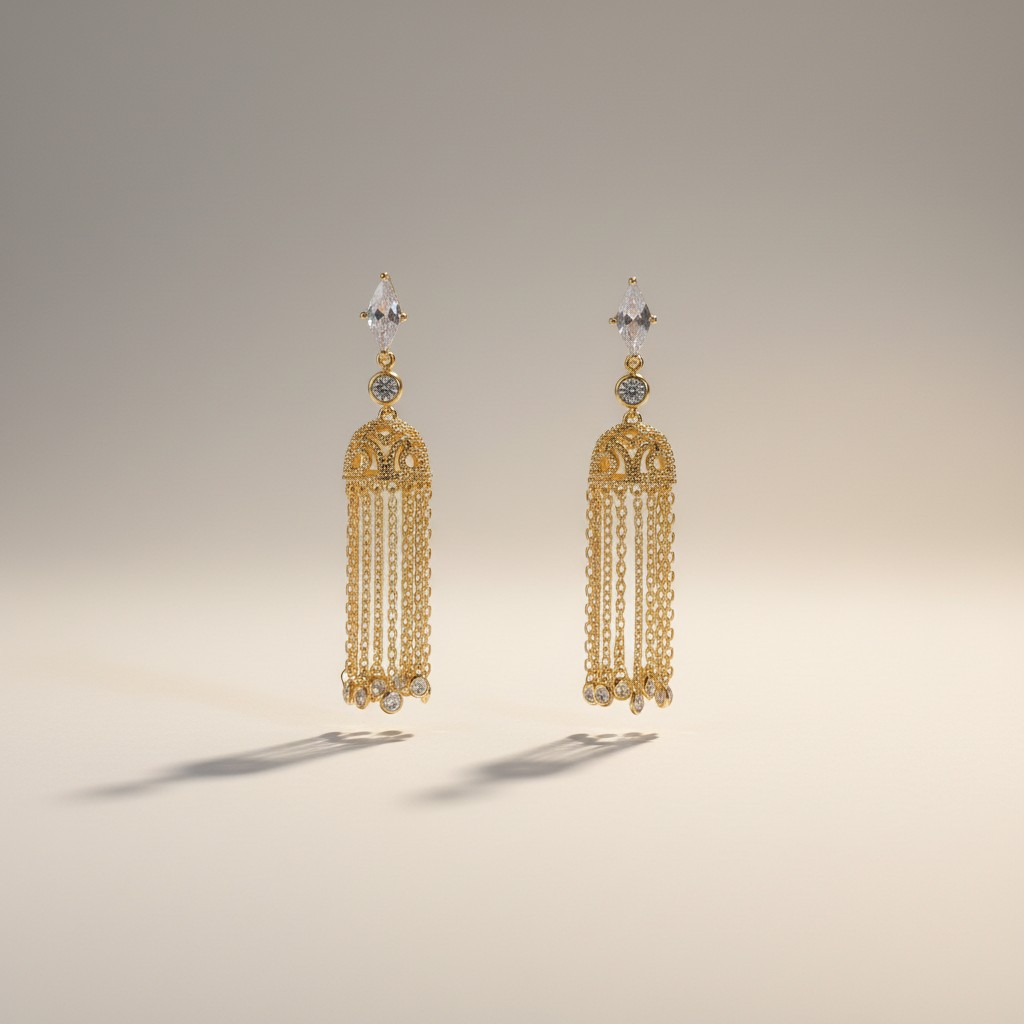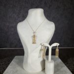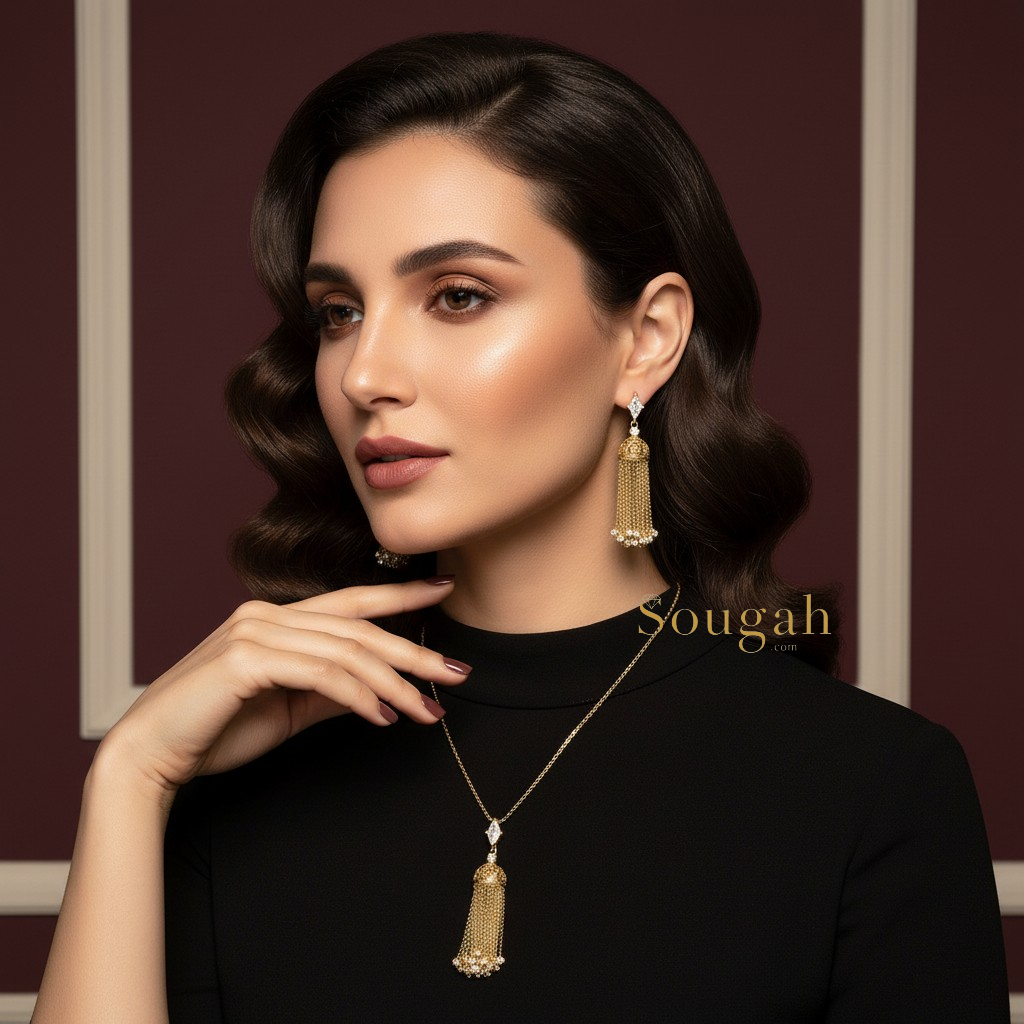 طقم مطلي ذهب بتصميم رقيق يتكوّن من عقد بسلسلة ناعمة وتعليقة تنسدل منها سلاسل ذهبية خفيفة، مع أقراط متناسقة تضيف حركة أنثوية جذابة للإطلالة. مرصّع بحجر الزركون ليمنح بريقًا هادئًا يناسب الإطلالات اليومية والمناسبات الخاصة. قطعة خفيفة على العنق، سهلة التنسيق، ومثالية لمن تحب الأناقة الناعمة.